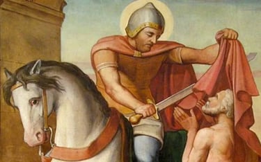 È uno dei Santi più venerati in Occidente, patrono delle Guardie Svizzere pontificie e di mendicanti, albergatori, cavalieri. È venerato dalla Chiesa Cattolica e anche da quelle ortodossa e copta. È uno dei fondatori del monachesimo in Occidente e uno dei primi santi non martiri proclamati dalla Chiesa. Ma ciò che ha reso famoso San Martino di Tours, in Francia, è l'episodio del mantello. Dopo essere stato battezzato come cristiano, a quarant’anni Martino lascia l’esercito e, durante il suo peregrinare in Europa, vive per quattro anni come eremita proprio nell’isola Gallinara, di fronte ad Albenga. Ed ecco la storia di questo personaggio che ha scritto una pagina importante della storia albenganese. Nato da genitori pagani, «Un giorno, mentre era a cavallo, presso la porta di Amiens, incontrò Cristo nelle sembianze di un povero: senza esitare, taglio il suo mantello in due parti e una la diede al misterioso mendicante. L’incontro era destinato a cambiare il corso della vita del baldanzoso guerriero: infatti, di li a poco Martino abbandono la vita militare, per diventare, con il battesimo, soldato di Cristo». Nel 371, a quarant’anni, fu eletto vescovo di Tours. Amante della vita ascetica e contemplativa, costruì numerosi monasteri e si dedicò a all’evangelizzazione, predicando soprattutto nei villaggi e nelle campagne. Vero è che il giovane Martino, ancora civile, si rifugiò sull’isola nel 359 quando fuggì da Milano per la persecuzione degli Ariani […] Su quella terra visse più di un anno: la tradizione indica ancora oggi la grotta sull’irta scogliera di sud-est dove egli dimorò». Padre Taggiasco, nel testo, si chiede il motivo che portò Martino, in fuga da Milano, a rifugiarsi proprio ad Albenga: «Fu caso o scelta voluta? Verosimilmente fu una meta voluta. L’antica diocesi di Albenga, nota per la sua ortodossia, si configurò come il desiderato riparo e l’isola che gli si parò dinanzi, poteva essere un’idonea dimora, appartata e sicura. Ad Albenga, per analoghi motivi, avevano trovato rifugio altri fedeli fuggiti da Milano e per Martino fu come “trovarsi a casa. Secondo la leggenda, dunque San Martino trovò rifugio in una grotta rivolta verso il mare aperto, che ancora oggi porta il suo nome. L'isola è legata alla figura di san Martino di Tours, impegnato nella lotta contro l'eresia ariana, che venne per questo anche frustato (nella nativa Pannonia) e cacciato, prima dalla Francia, poi da Milano, dove erano stati eletti vescovi ariani. Nel 357 si recò quindi sull'Isola Gallinara, dove condusse quattro anni di vita in eremitaggio parziale, poiché non del tutto solo, visto che le cronache segnalano che sarebbe stato in compagnia di un prete, uomo di grandi virtù, probabilmente Sulpicio Severo[7], e per un periodo con Ilario di Poitiers; su quest’isola si cibava di elleboro, una pianta che ignorava fosse velenosa. Una leggenda narra che trovandosi in punto di morte per aver mangiato quest’erba, pregò e venne miracolato. Lasciò l'isola per tornare quindi a Poitiers. Nel nostro Santuario di Pontelungo un quadro racconta la fuga di San Martino sulla Gallinara. Il quadro, restaurato e ben custodito, raffigura San Martino, Vescovo di Tours, «colto nell’atto di benedire la città di Albenga e la Riviera dall’isola Gallinara». Un’opera storica realizzata da Leonardo Massabò, custodita nella Cappella laterale sinistra della chiesa di Pontelungo che testimonia la presenza del santo sull’isola al largo di Albenga.